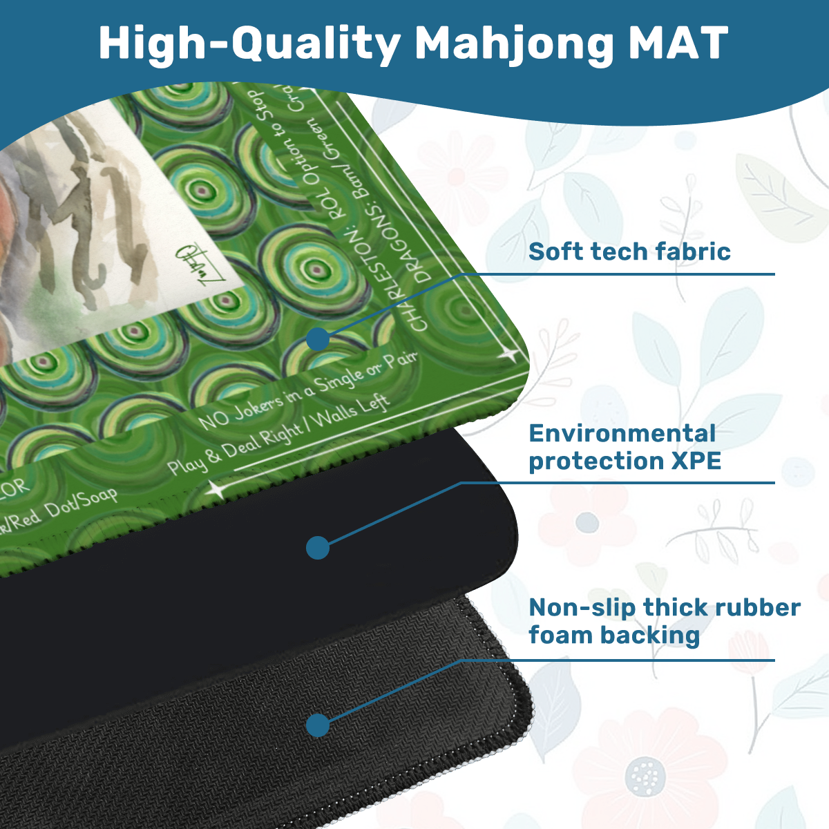 - Premium Quality: Made from durable polyester with a non-slip backing to eliminate movement. Generous Size: 33"x33" square, 3mm thick for a comfortable and stable playing surface. Noise-Reducing & Table-Protecting: Smooth, soft top reduces tile clatter and stops table scratches. Complete Set: Includes Mahjong mat & storage bag.