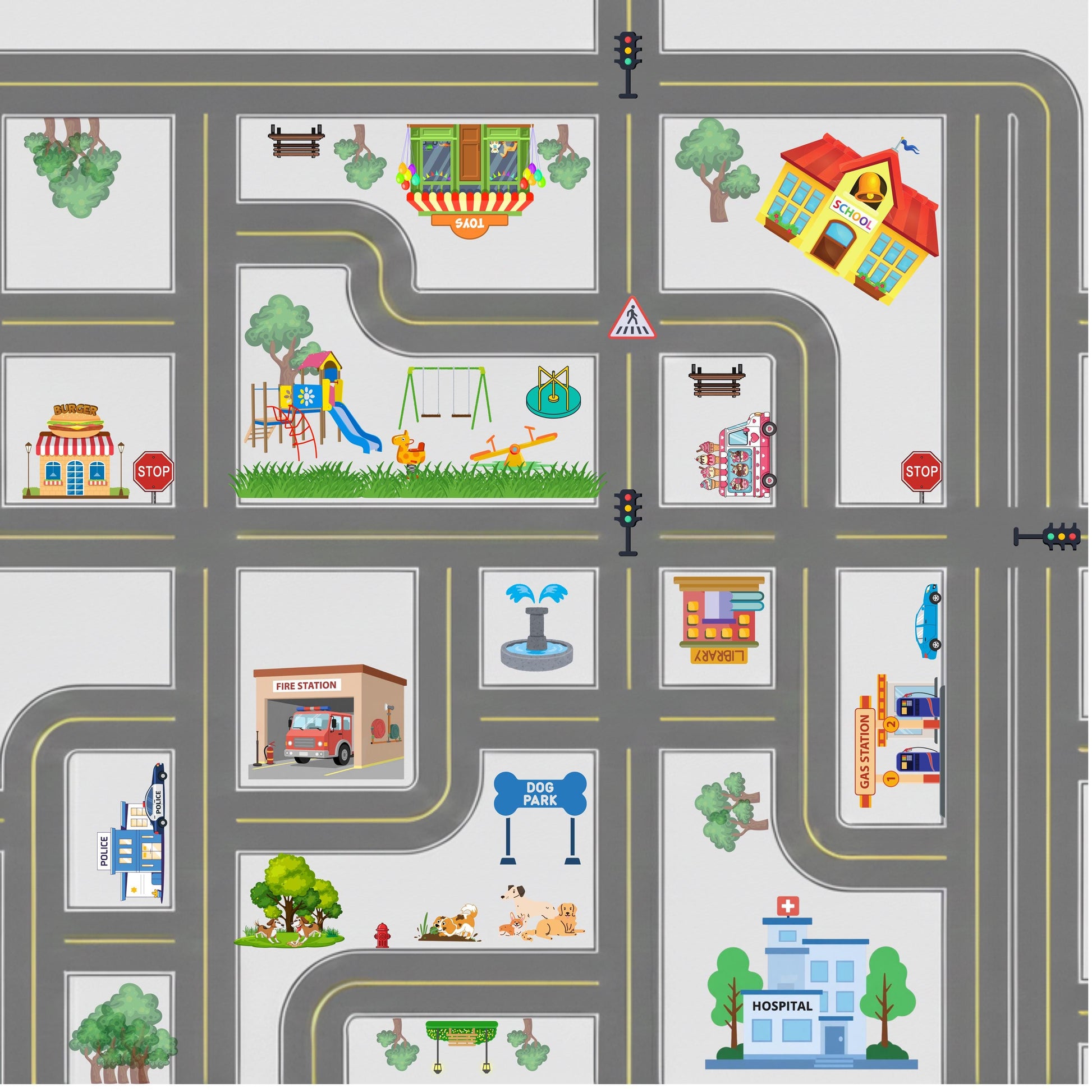 Want to play racecars on the go? Need a fun activity without a screen for your child who loves cars and trucks? This neighborhood game mat has all the fun stops for any car-kid! Our top-quality 31.5 x 31.5-inch game mat is super soft and durable and rolls up for on-the-go fun. The non-slip grip on the back means no more shifting, even during the most exciting rounds. Get ready to level up your game nights! Ships folded, lay flat for a few hours to flatten or pop in the dryer on low for a few mins. Will continue to flatten over time with play. Comes with storage sleeve. 3mm in thickness.